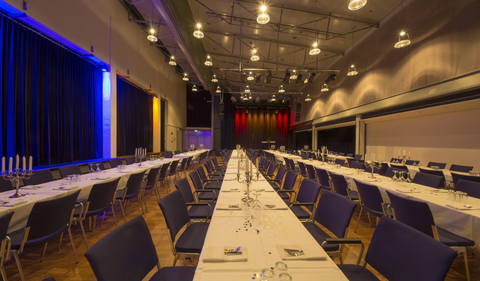 Zur Ausstattung gehören eine im Saal integrierte Bar, eine Besuchergarderobe sowie Toiletten.